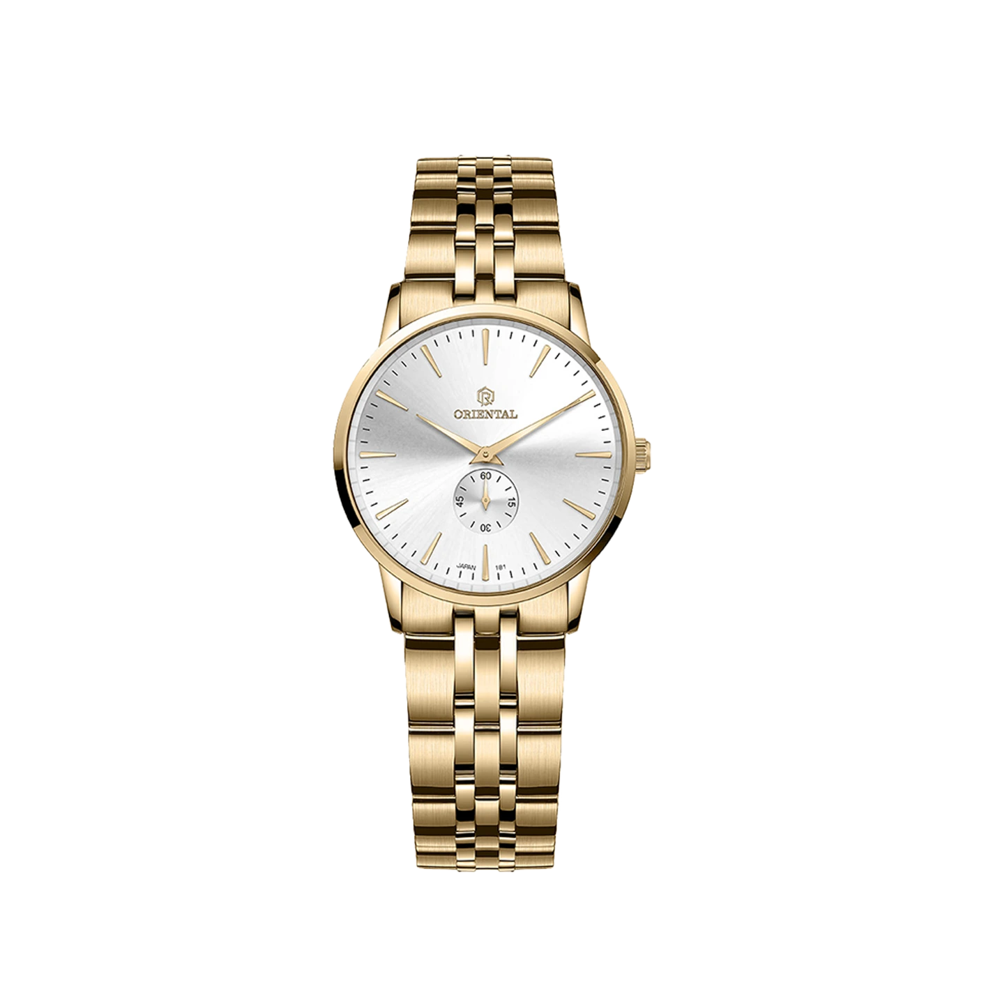 ساعت اورینتال زنانه کد O.SH181L-0001 با بند و قاب طلایی و صفحه سیلور، تلفیقی از زیبایی، اصالت و کیفیت برای بانوان شیکپوش و خاصپسند است.