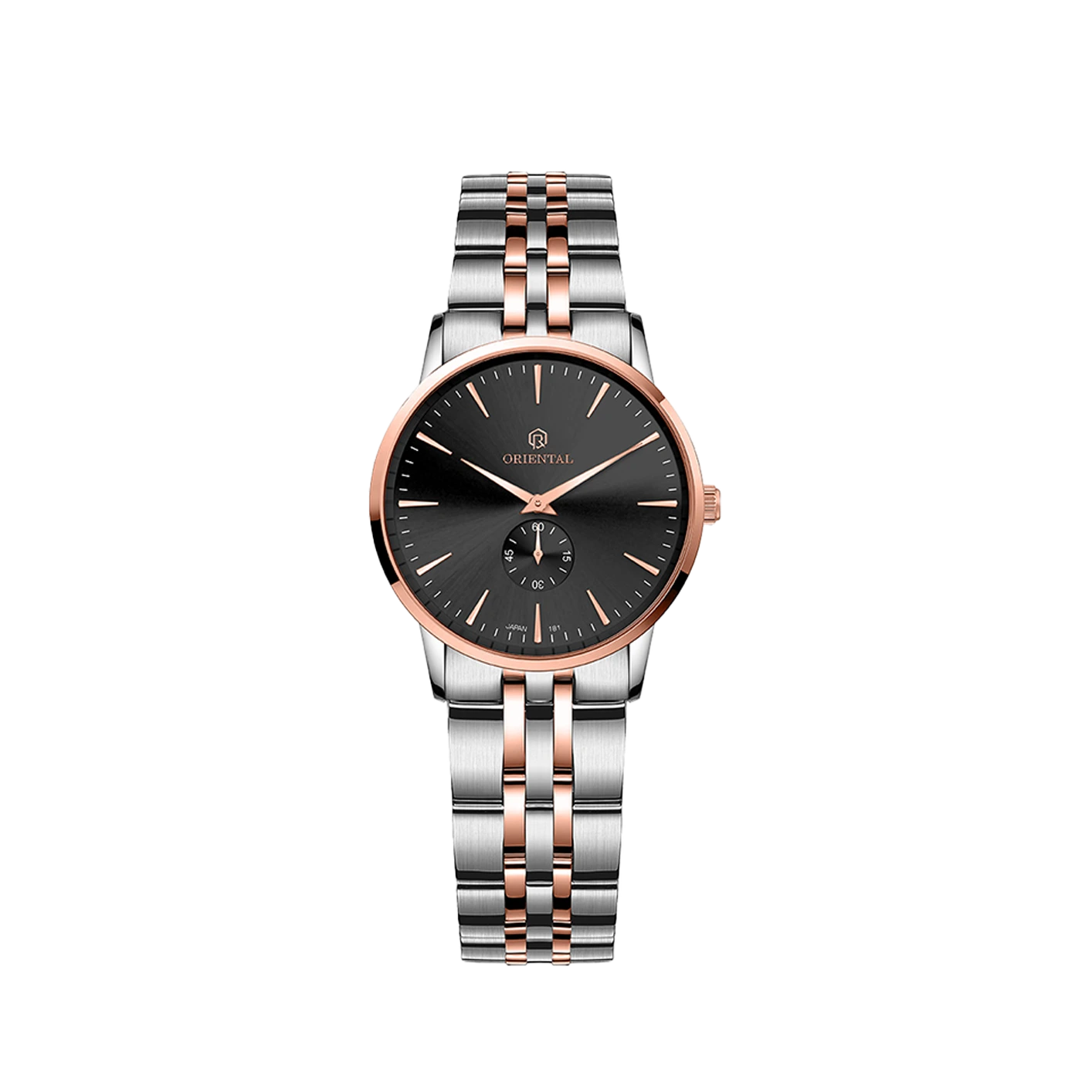 ساعت اورینتال زنانه کد O.SH181L-0007 با بند رزگلد و صفحه مشکی، ترکیبی از ظرافت و جسارت است؛ مناسب بانوانی با استایل لوکس و سلیقهای خاص.